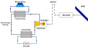 To σύστημα, που απεικονίζεται στην εικόνα 2, αποτελείται από έναν ερμητικού τύπου συμπιεστή scroll με τον κινητήρα του, δύο πλακοειδείς εναλλάκτες θερμότητας (ατμοποιητή και συμπυκνωτή), μια εκτονωτική βαλβίδα, τη μονάδα απόρριψης θερμότητας και τα φ/β πάνελ.