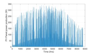 Το αποτέλεσμα της προσομοίωσης της ετήσιας παραγωγής ηλεκτρικής ενέργειας ήταν 2.691,7 kWhel, και μια επισκόπηση του προφίλ της ετήσιας παραγωγής ενέργειας με ωριαίο βήμα του φ/β φαίνεται στην εικόνα 4. Παρά τη σχετική χαμηλή ηλιακή ακτινοβολία, τα φωτοβολταϊκά πάνελ έχουν επαρκή απόδοση χάρη στις χαμηλότερες μέσες θερμοκρασίες, οι οποίες ψύχουν