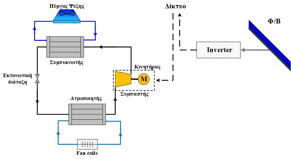 Εικ. 2. Σχηματική απεικόνιση υπό μελέτη συστήματος φωτοβολταϊκών – αντλιών θερμότητας.