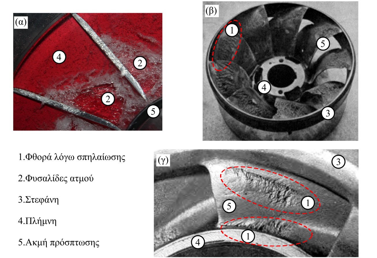 Η λειτουργία μιας φυγοκεντρικής αντλίας σε συνθήκες σπηλαίωσης ακόμη και για σύντομο χρονικό διάστημα, εάν το φαινόμενο είναι έντονο, μπορεί να προκαλέσει εκτεταμένες φθορές στα πτερύγια και στην πτερωτή μιας αντλίας (σχ. 1β, γ), μειώνοντας την ενεργειακή της απόδοση. Επιπροσθέτως, η απώλεια μάζας από τις στρεφόμενες επιφάνειες οδηγεί σε σημαντική αύξηση του επιπέδου των κραδασμών, λόγω της προκληθείσας αζυγοσταθμίας, οι οποίοι με τη σειρά τους επιβαρύνουν τις εδράσεις της μηχανής.