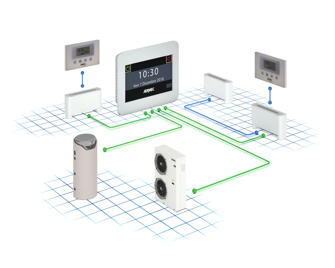Με το σύστημα μεταβλητής παροχής VMF της Aermec είναι δυνατή η διαχείριση της ψύξης, θέρμανσης και παραγωγής ζεστού νερού χρήσης ενός κτιρίου. Το VMF που προτείνει η Calda Energy επιτρέπει τον πλήρη έλεγχο των επιμέρους μονάδων μιας εγκατάστασης (όπως είναι η αντλία θερμότητας, τα fan coil, τα συστήματα θέρμανσης / δροσισμού επιφανειών, ο κυκλοφορητής, ο λέβητας κλπ., οι οποίες επικοινωνούν μεταξύ τους με κύριο στόχο τη μέγιστη απόδοση και εξοικονόμηση ενέργειας του συστήματος χωρίς απώλεια άνεσης στο χώρο.