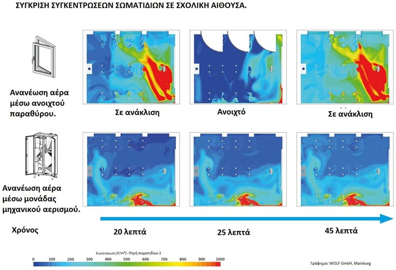 Κατά την διάρκεια μιας σχολικής ώρας συγκεντρώνονται σε αρκετά υψηλές συγκεντρώσεις μέσα στη σχολική αίθουσα, ακόμα και με τον εξαερισμό μέσω των παραθύρων, σωματίδια σε μορφή αεροζόλ, τα οποία είναι πιθανό να επιμολύνουν τους παρευρισκόμενους. Στο συμπέρασμα αυτό καταλήγει η μελέτη που πραγματοποιήθηκε από την εταιρεία WOLF GmbH, ειδική στον χώρο του εξαερισμού, με την βοήθεια του Πολυτεχνείου του Βερολίνου. «Τα σωματίδια που μεταφέρονται με τον αέρα εξαπλώνονται ταχύτατα στον χώρο και μπορούν, λαμβάνοντας υπόψιν τον εξαερισμό μέσω ανοιχτού παραθύρου, να μειωθούν αποτελεσματικά μόνο με συχνή αλλαγή του αέρα.», υποστηρίζει ο Prof. Dr.-Ing. Martin Kriegel, διευθυντής του Ινστιτούτου Hermann-Rietschel. «Αν αυτή η τεχνική εφαρμοζόταν ουσιαστικά, θα επηρέαζε από πολλές απόψεις το μάθημα». Απέναντι στην συμβατική εκδοχή εξαερισμού μέσω ανοιχτών παράθυρων που εξετάζεται , βρίσκεται η χρήση μονάδων αερισμού με ανάκτηση θερμότητας , η οποία συμβάλει στο να αποφευχθεί η παρεμπόδιση του μαθήματος από εξωτερικούς παράγοντες (θόρυβο, κρύο/ζέστη, υγρασία) και ταυτόχρονα να μειώσει αισθητά την συγκέντρωση σωματιδίων σε σχέση με αυτήν στην περίπτωση εξαερισμού μέσω ανακλινόμενου παραθύρου.