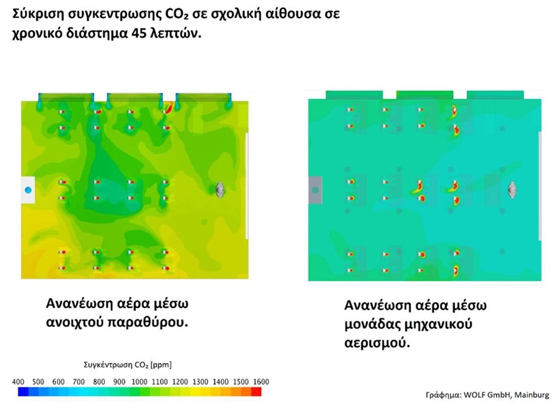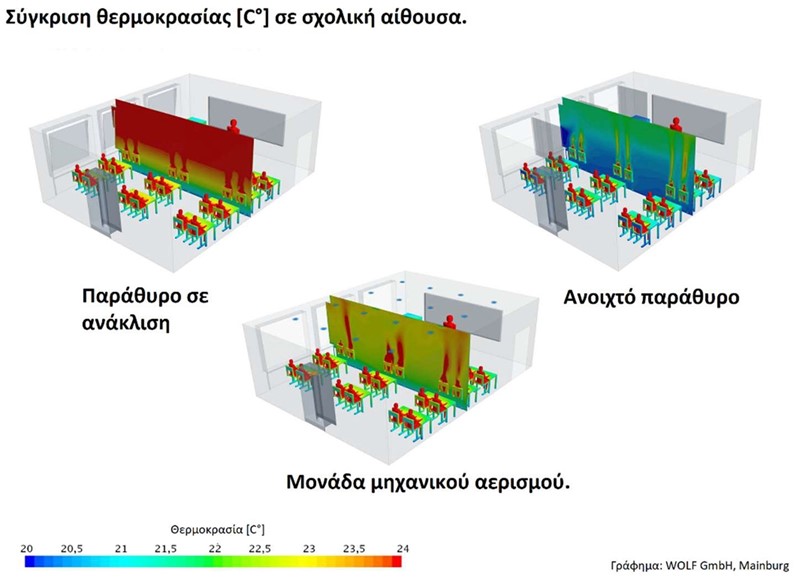 «Η μελέτη αποδεικνύει σαφέστατα, ότι ο αναγκαίος ρυθμός εναλλαγής του αέρα, με σκοπό την επίτευξη υγιεινού αέρα σε εσωτερικούς χώρους, ειδικά στην περίοδο που διανύουμε με τον COVID 19, με την εκδοχή ανανέωσης αέρα μέσω πλήρως ανοιχτών παραθύρων μπορεί να επιτευχθεί μόνο με υψηλές δαπάνες και θερμικές απώλειες. Με την προσθήκη μίας εγκατάστασης μηχανικού αερισμού με ανάκτηση, με την ανάλογη εναλλαγή αέρα, μπορούν να μειωθούν σε λογικές τιμές τόσα τα επίπεδα διοξειδίου του άνθρακα όσο και η επιβάρυνση του αέρα από σωματίδια σε μορφή αεροζόλ. Για όσον καιρό ακόμα συνεχίζεται η έρευνα για τον COVID 19, μπορεί η διαδικασία ανανέωσης αέρα να υποστηριχθεί επιπλέον και με την χρήση πλήρως ανοιχτών παράθυρων κατά την διάρκεια του διαλλείματος.» υποστηρίζει ο Bernhard Steppe, μέλος του Δ.Σ. της WOLF GmbH. Μόνο στην διάρκεια των περασμένων 12 μηνών η εταιρεία κατάφερε να εξοπλίσει περίπου 300 εκπαιδευτικά ιδρύματα σε όλη την Γερμανία με υψηλής ποιότητας μονάδες αερισμού με ανάκτηση θερμότητας. Σε σύγκριση με την μέθοδο εξαερισμού με πλήρως ανοιχτά παράθυρα, οι μονάδες αυτές προσφέρουν μια σημαντική εξοικονόμηση ενέργειας , παίρνοντας υπόψιν και τους στόχους που αφορούν την κλιματική προστασία μέχρι το 2030. Μέσω της αποτελεσματικής μεθόδου ανάκτησης θερμότητας με 4 απόδοση έως και 90%, επιτυγχάνονται οικολογικές αλλά και οικονομικές προστιθέμενες αξίες, σε αντίθεση με τον εξαερισμό μεσώ παραθύρων, αφού αποτρέπεται η αποβολή ανεκμετάλλευτης της ενέργειας θερμότητας και ενέργειας ψύξης – η οποία έχει προηγουμένως επιτευχθεί μέσα στον εσωτερικό χώρο- ».