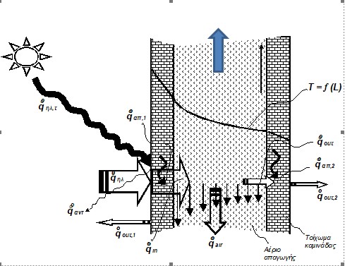Η ηλιακή καμινάδα διέπεται από όλα όσα αναφέρθηκαν για τους κατακόρυφους αγωγούς φυσικού ελκυσμού. Το ιδιαίτερο στοιχείο που τη χαρακτηρίζει είναι η αύξηση της εσωτερικής της θερμοκρασίας από την προσπίπτουσα σ’ αυτήν ηλιακή ακτινοβολία. Στο σχήμα 2 απεικονίζεται αυτό το φαινόμενο.