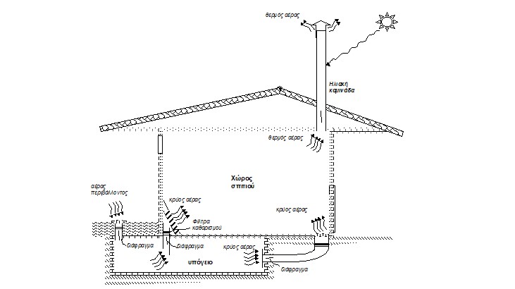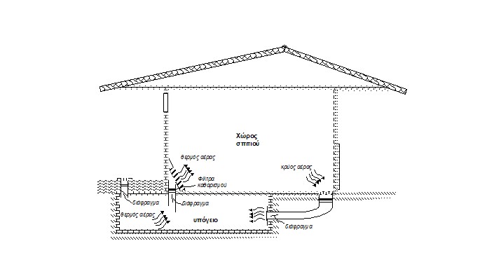 Σχήμα 3: Θέρμανση χώρου με φυσική κυκλοφορία του αέρα του υπογείου.