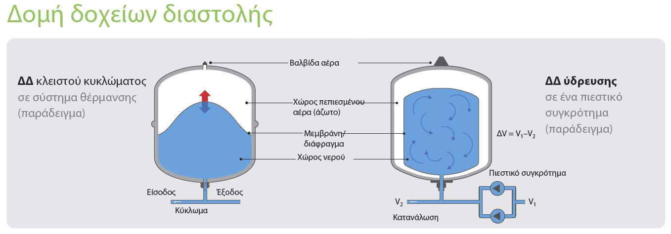 Η τοποθέτηση των δοχείων διαστολής μπορεί να γίνει είτε στην αναρρόφηση των αντλιών είτε στην κατάθλιψη (βλ. εικ. 7). Όταν τα δοχεία διαστολής είναι τοποθετημένα στην αναρρόφηση εκτονώνουν την πίεση του συνδετικού αγωγού, ενώ όταν είναι τοποθετημένα στην κατάθλιψη μειώνουν τον αριθμό εκκινήσεων των αντλιών.