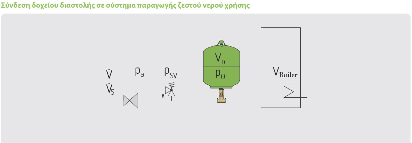 Τα δοχεία διαστολής χρησιμοποιούνται επίσης στα συστήματα παραγωγής ζεστού νερού χρήσης (βλ. εικ. 5), όπου τοποθετούνται στην προσαγωγή του κρύου νερού των θερμοδοχείων παραγωγής ζεστού νερού (μπόιλερ), προκειμένου να αποτρέψουν την ενεργοποίηση της βαλβίδας ασφαλείας και την διαρροή νερού.