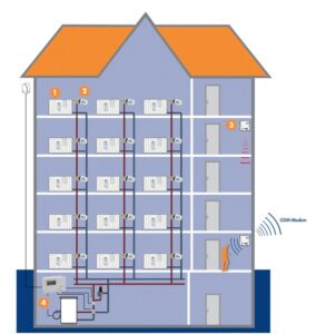 1) ατομικός κατανεμητής κόστους θερμότητας, 2) θερμοστατική βαλβίδα σώματος, 3) συλλέκτης ραδιοκυμάτων από κατανεμητές κόστους θερμότητας, 4) καιρική αντιστάθμιση για το νερό θέρμανσης του λέβητα)