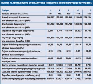 Στον πίνακα 1 παρουσιάζονται τα βασικά μεγέθη για τα διάφορα εξεταζόμενα σενάρια, από τα οποία προκύπτει η προαναφερόμενη διαστασιολόγηση των ηλιακών πεδίων. Οι περίοδοι αποπληρωμής του έργου υπολογίζονται στη βάση της μείωσης του κόστους παραγωγής θερμότητας λόγω της απαλοιφής της κατανάλωσης πετρελαίου θέρμανσης και ηλεκτρικής ενέργειας.