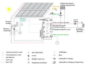 Το προτεινόμενο σύστημα χρησιμοποιεί την υφιστάμενη υποδομή του σταδίου αναφορικά με τη διανομή θερμότητας από τα θερμοδοχεία αποθήκευσης στις τελικές χρήσεις, σε αποδυτήρια ή κολυμβητικές δεξαμενές. Η παραγωγή θερμότητας για ζεστό νερό χρήσης σήμερα στηρίζεται αποκλειστικά στη χρήση πετρελαίου σε έναν κεντρικό καυστήρα πετρελαίου και ηλεκτρικής ενέργειας, μέσω αντιστάσεων που υπάρχουν στα υφιστάμενα τέσσερα θερμοδοχεία, τα οποία βρίσκονται εγκατεστημένα στις τέσσερις γωνίες του σταδίου.
