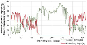 Στο σχήμα 3 παρουσιάζεται η ετήσια διακύμανση του ποσοστού αποθήκευσης ημερήσιας θερμότητας από τους ηλιακούς συλλέκτες και από τον καυστήρα βιομάζας ως προς την ημερήσια ζήτηση θερμότητας.