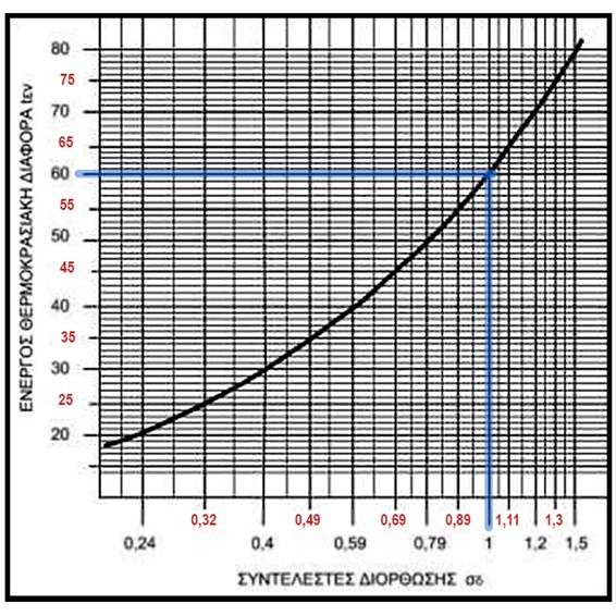 Αφού βρεθεί το tεν, στη συνέχεια, με τη βοήθεια του διαγράμματος 1, μπορούμε να υπολογίσουμε το συντελεστή διόρθωσης, όπως φαίνεται σε αυτό το παράδειγμα με την μπλε γραμμή.