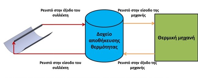 Η ενέργεια που παράγεται αποθηκεύεται σε ένα θερμικό δοχείο αποθήκευσης, έτσι ώστε να αξιοποιηθεί αργότερα και να υπάρχει μια εξισορρόπηση των θερμοκρασιών μεταβολών στο σύστημα. Πιο συνηθισμένος τρόπος αποθήκευσης είναι με ένα μονωμένο δοχείο αισθητής θερμότητας. Η χρήση θερμοκλίνης με πέτρες εντός του δοχείου είναι ένας τρόπος για βελτίωση της απόδοσης του δοχείου και μείωση του κόστους εγκατάστασης