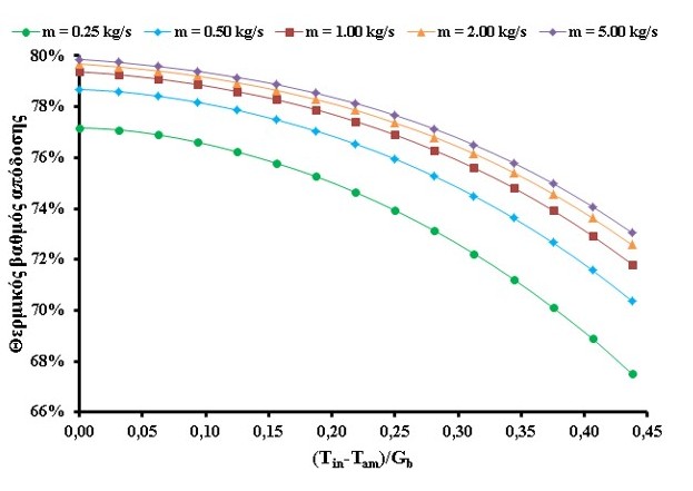 Η εικόνα 4 δείχνει ότι η θερμική απόδοση για μηδενική γωνία πρόσπτωσης είναι εν γένει υψηλή και μεγαλύτερη από 66% για όλες τις εξεταζόμενες συνθήκες. Χρησιμοποιείται θερμικό έλαιο το οποίο λειτουργεί έως τους 400oC περίπου για λόγους ασφαλείας. Επίσης, είναι σημαντικό να αναφερθεί ότι για παροχή μάζας μεγαλύτερης του 1 kg/s, η απόδοση πλησιάζει τις μέγιστες δυνατές τιμές.
