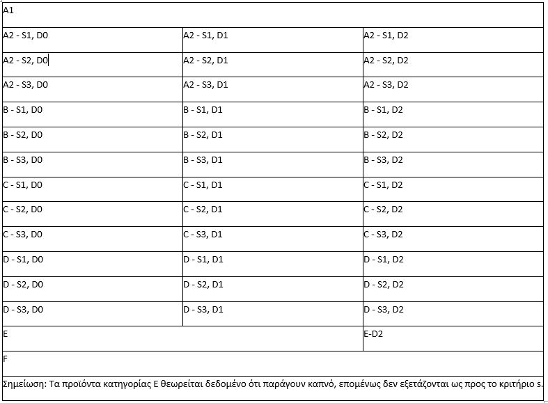 Σημείωση: Τα προϊόντα κατηγορίας Ε θεωρείται δεδομένο ότι παράγουν καπνό, επομένως δεν εξετάζονται ως προς το κριτήριο s.