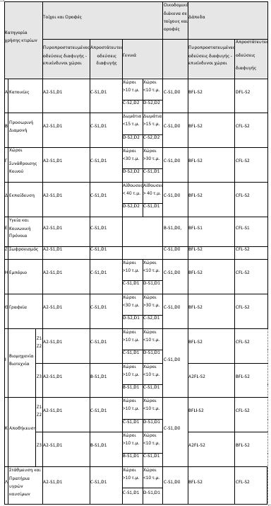 Πίνακας 13 του Προεδρικού Διατάγματος 41/2018: Ελάχιστες απαιτήσεις αντίδρασης στη φωτιά για εσωτερικά τελειώματα και δάπεδα ανά κατηγορία χρήσης κτιρίου
