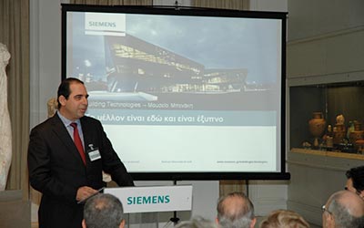 Κατά τη διάρκεια των εκδηλώσεων, ο κ. Γιώργος Κοτταράς, Διευθυντής του Τμήματος Προϊόντων και Συστημάτων Κτηριακού Αυτοματισμού της Siemens, ανέδειξε τη μακρά ιστορία και την πλούσια τεχνογνωσία της εταιρείας στο συγκεκριμένο κλάδο, με χιλιάδες έργα εγκατεστημένης βάσης στην Ελλάδα και όλο τον κόσμο. Ο κ. Κοτταράς αναφέρθηκε ακόμα στα ιδιαίτερα χαρακτηριστικά και τα ειδικά οφέλη που προσφέρει το καινοτόμο και ολοκληρωμένο χαρτοφυλάκιο της Siemens. Η σειρά προϊόντων HVAC (heating, ventilation and air conditioning) της Siemens καλύπτει όλες τις ανάγκες, καθώς περιλαμβάνει κεντρικά συστήματα ελέγχου, τυπικούς κτηριακούς αυτοματισμούς, θερμοστάτες, αισθητήρες, βάνες, κινητήρες, κινητήρες διαφραγμάτων, ρυθμιστές στροφών και θερμιδομετρητές