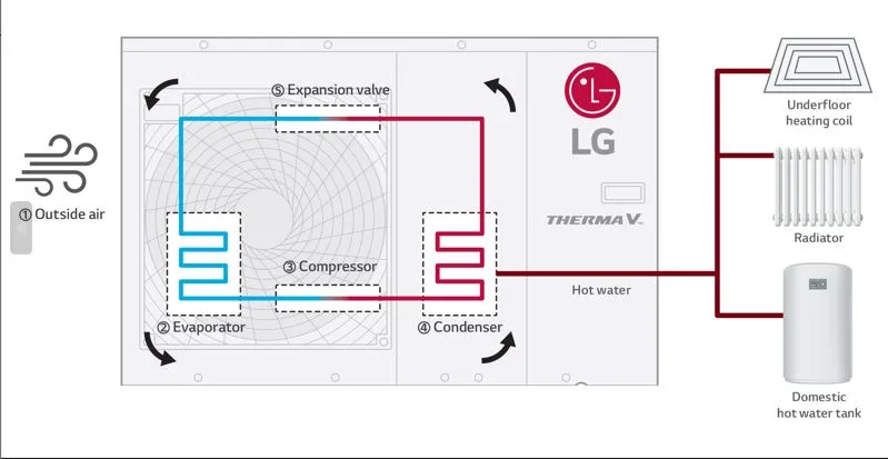 Η αντλία θερμότητας δεν χρησιμοποιεί καύση για να ζεστάνει το νερό, με το οποίο τροφοδοτεί τα σώματα. Με τη χρήση ηλεκτρικής ενέργειας, λειτουργεί τον ψυκτικό κύκλο (όπως ακριβώς λειτουργεί μια κλιματιστική μονάδα) και απορροφά θερμότητα από τον αέρα του περιβάλλοντος και αυτή τη θερμότητα την περνάει στο νερό με το οποίο τροφοδοτεί τα σώματα.