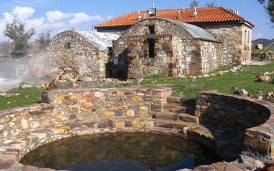 Δεξιά υπάρχουν στην σειρά χαμηλά κτίσματα, ανάμεσα σε ευκαλύπτους είναι τα λουτρά με τις δεξαμενές που ανακαινίστηκαν επάνω στα παλιά που λειτουργούσαν πριν χρόνια. Αυλάκια παλιά, και καινούργια. Νερό που τρέχει ελεύθερο και αχνίζει, βάφοντας κόκκινο τον πυθμένα από θερμόφιλα ζωύφια (φύκι) που αναπτύσσονται. Ποιο πέρα πίσω από ένα δάσος από βρούλα, στέκεται όρθιο ένα συγκρότημα κτηρίων, με τους μακρόστενους κοιτώνες και τα αψιδωτά κτίσματα των παλιών δεξαμενών. Και συνεχίζοντας την περιγραφή πρέπει να αναφέρουμε το μικρό τρικάμαρο γεφύρι του Αλμυροπόταμου (από τα λίγα που σώζονται μέχρι και σήμερα) και πιο πέρα την παλιά βρύση από την κιτρινωπή και ροζ μαλακόπετρα.
